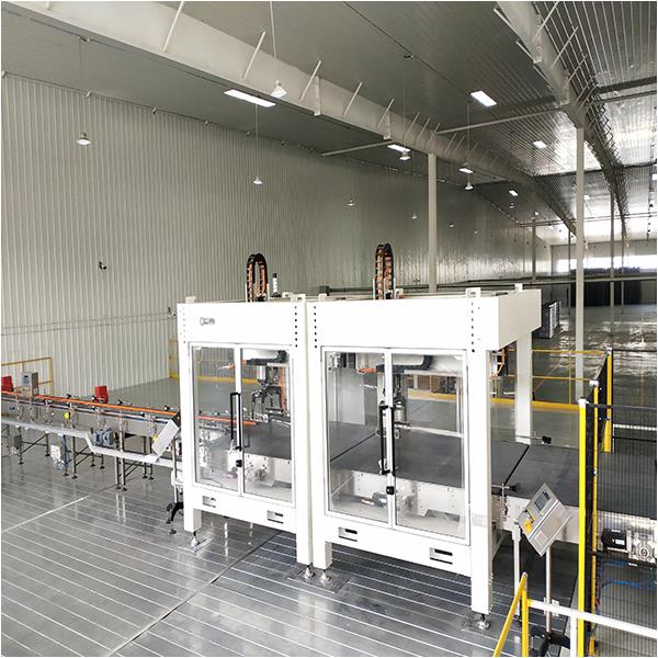 恒昌包裝自主生產(chǎn)制造的低位雙通道碼垛機,速度可達80包/分。